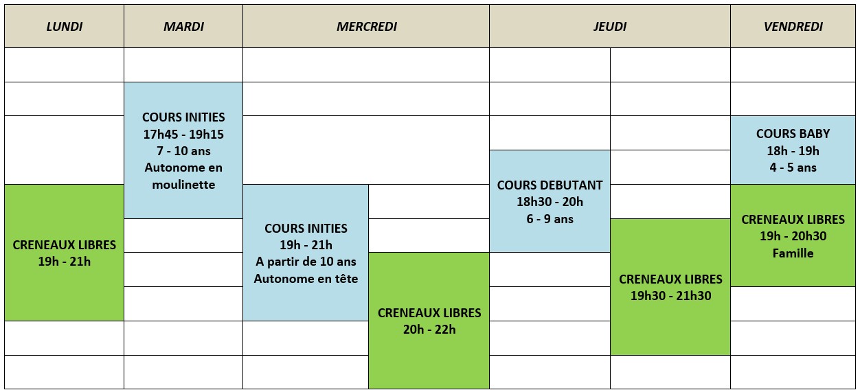 Les créneaux libres sont ouverts à tous les adhérents, quelque soit le jour choisi.